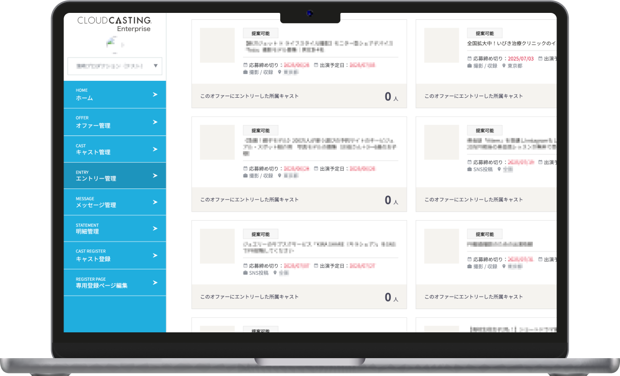 所属タレントのプロフィールを登録しておくだけで、条件に合致した案件が自動的に届きます。TV・CM・イベント・Web案件など幅広い案件に対応しています。また、クラウドキャスティングに登録している企業様のお仕事にエントリーいただくことで、お仕事の獲得が可能です。